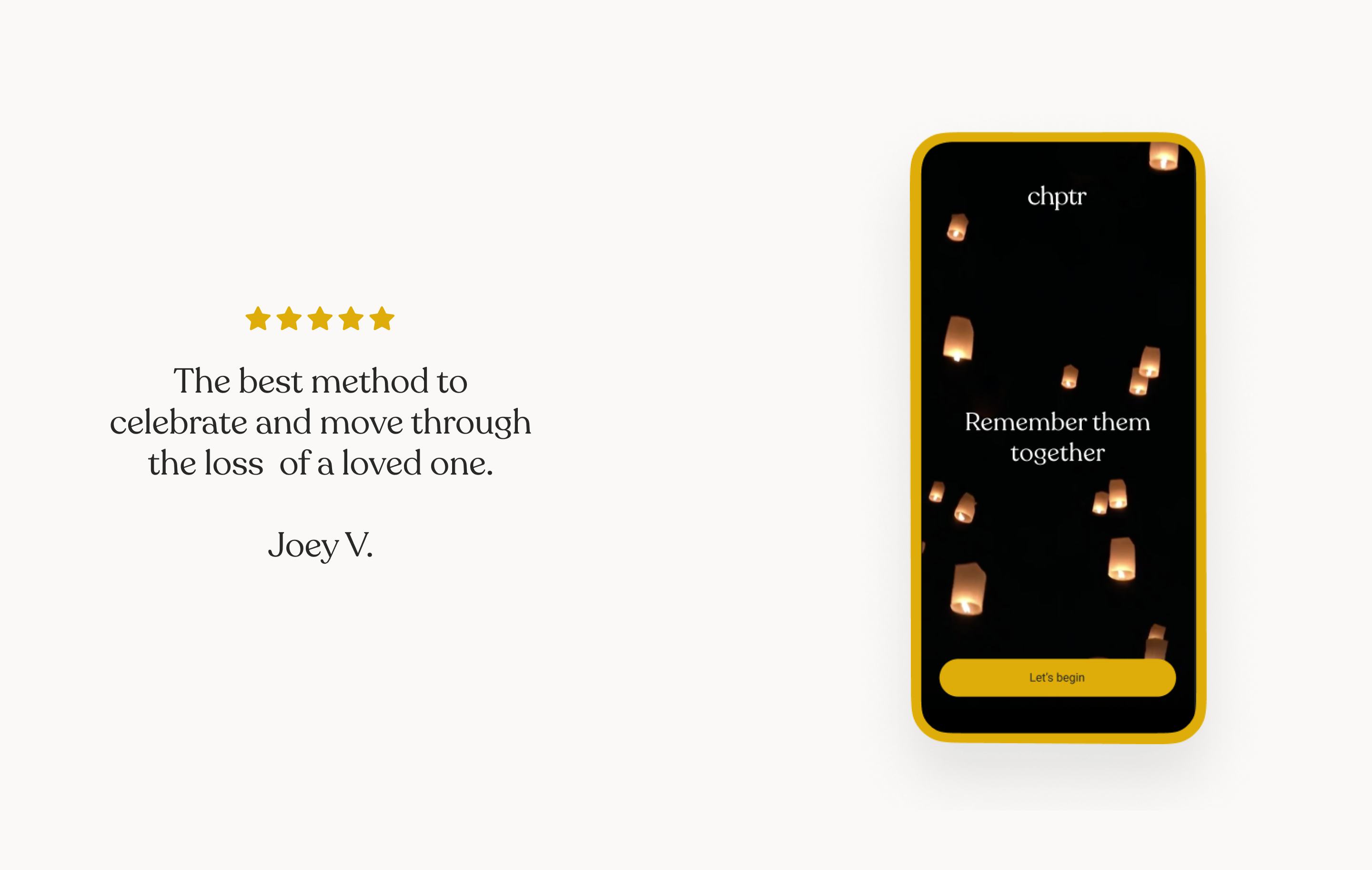 Chptr is the digital place to cope with the hardest part of our lives: saying goodbye to our loved ones. It is a useful tool for sharing what we want to remember about them. We can do it by safely storing memories like photos and videos, inviting friends to contribute to their stories, and discovering other Chptrs.