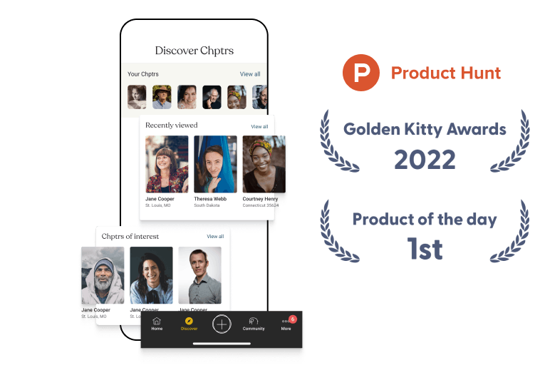 Product hunt is a web for product-loving enthusiasts to review new tech products where Chptr was voted 1st Product of the day, part of the Top #5 of the week, and named the #4 Community & Social app of the year by the Golden Kitty Awards.